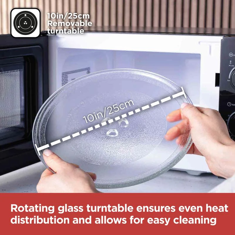 Stylish Black & Decker microwave cooks meals in minutes. 5 power functions, 800W max power. 20L capacity, fits 10in/25.5cm plate. 5 power settings, 800W output. 35-min timer. Defrost function. Glass turntable for even heat circulation.