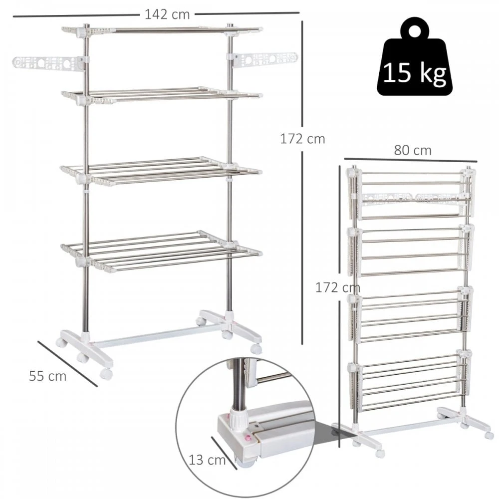 The Homcom foldable clothes airer is a perfect choice for drying your clothes. With the ability to have sections with different types of clothing makes it an ideal solution. With numerous hanging positions it gives a lot of flexibility and perfect for indoors or even in a balcony with limited space. Made with high quality stainless tubing and high quality lower footings it will last for a long time. It is easy to assemble and can fold when not in use, also with its smooth finish can easily be kept clean and maintained.