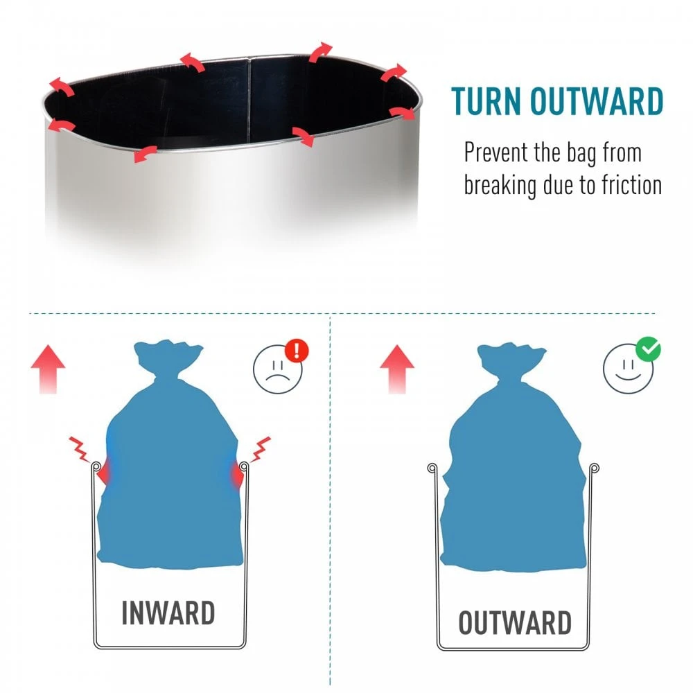 - LARGE CAPACITY:Efficient design requires no inner bucket and provided more capacity 48 liter (1.1Gallon) chrome trash can.Outward rolled lip to prevent bag snagging the retainer ring keeps bag in place and out of view.