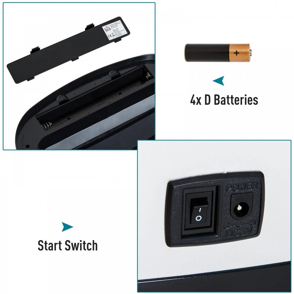- POWER REQUIRED: 4 x D batteries required (not included). Lid also opens manually or via buttons for your convenience. Efficient lid mechanism allows long battery life.