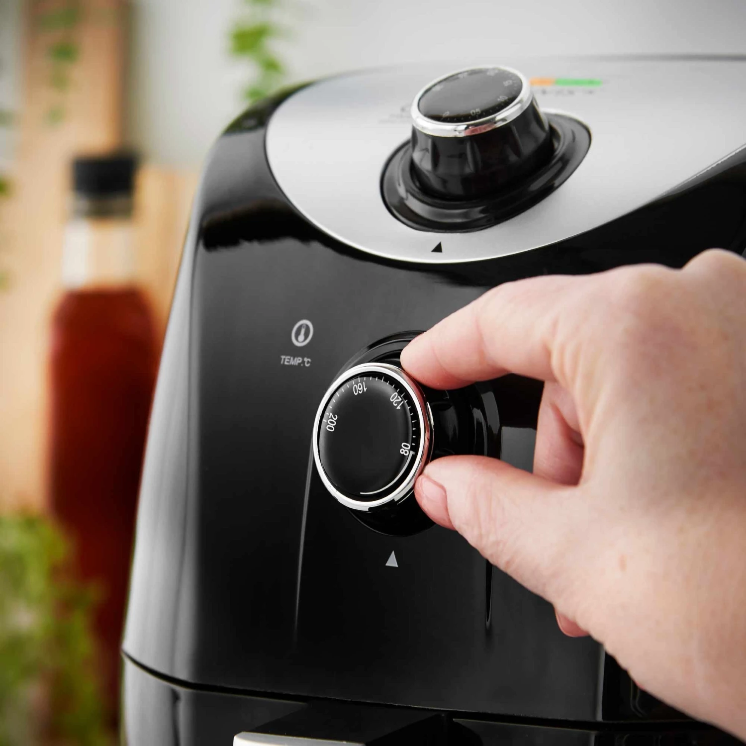 - ADJUSTABLE TEMPERATURE AND TIMER The air fryer comes equipped with an adjustable temperature function as well as a timer. These integrated features are operated by dials, allowing you to tweak cooking times and heat settings depending on the type of food youโre cooking.