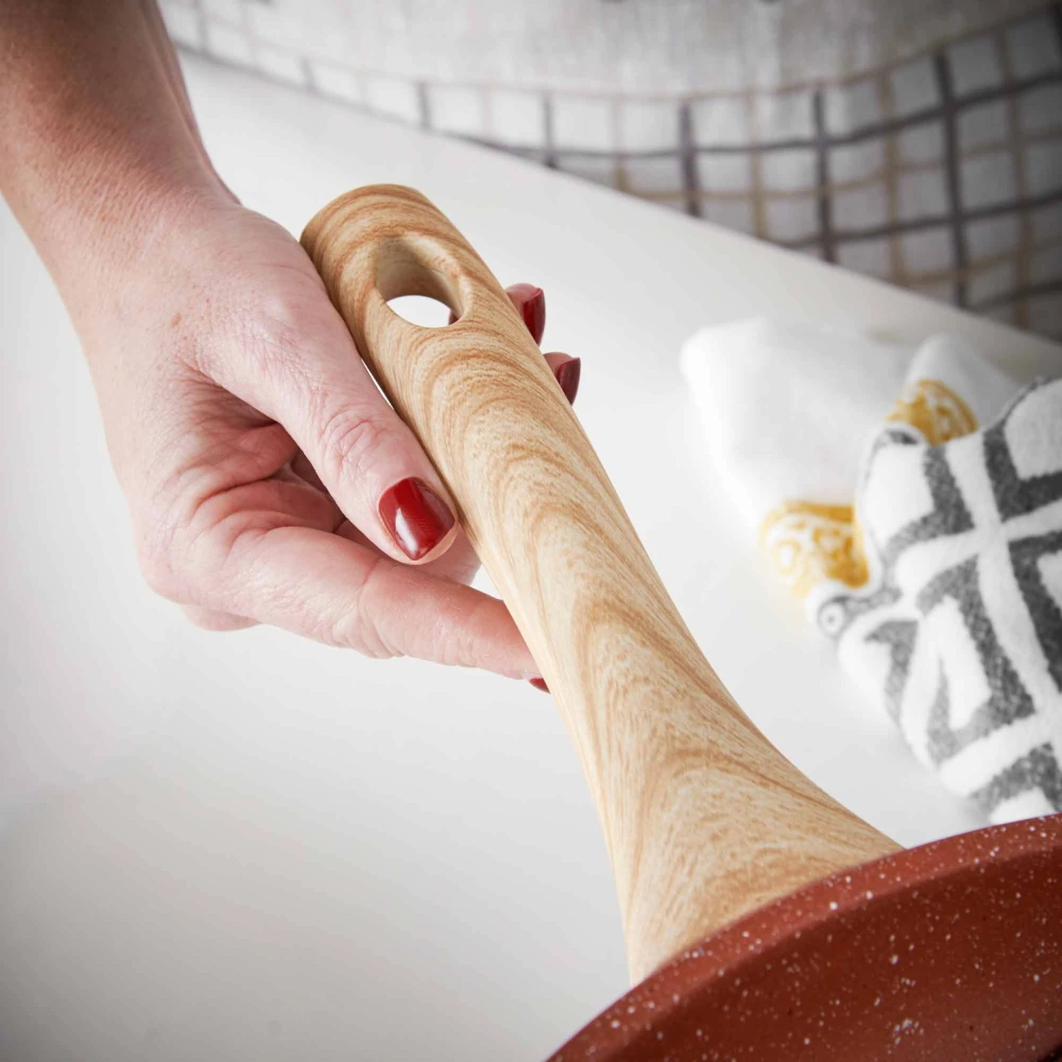 - SUPER STYLISH WOODEN HANDLES – This feature gives you optimal control and feels incredibly smooth and comfortable to the touch, allowing you to move the frying pan without fear of coming into contact with heat.