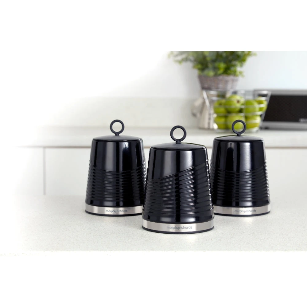 Neatly store tea, coffee and sugar on your kitchen counter with this stylish 3 piece canister set from Morphy Richards Dune range. Each canister is constructed from mirrored stainless steel to provide added durability, while the unique patterned exterior offers a contemporary visual appeal to your kitchen décor. The lids have an airtight seal to ensure the contents remain fresh and secure, while the large round loop handle gives you a comfortable grip for easy access to the contents. These canisters have a 1.3 litre capacity, letting you store large amounts of tea bags, coffee granules and sugar, making them perfect for busy households.