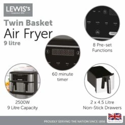 Lewis’s Air Fryer With Dual Twin Basket 9L – 2 X 4.5l Drawers