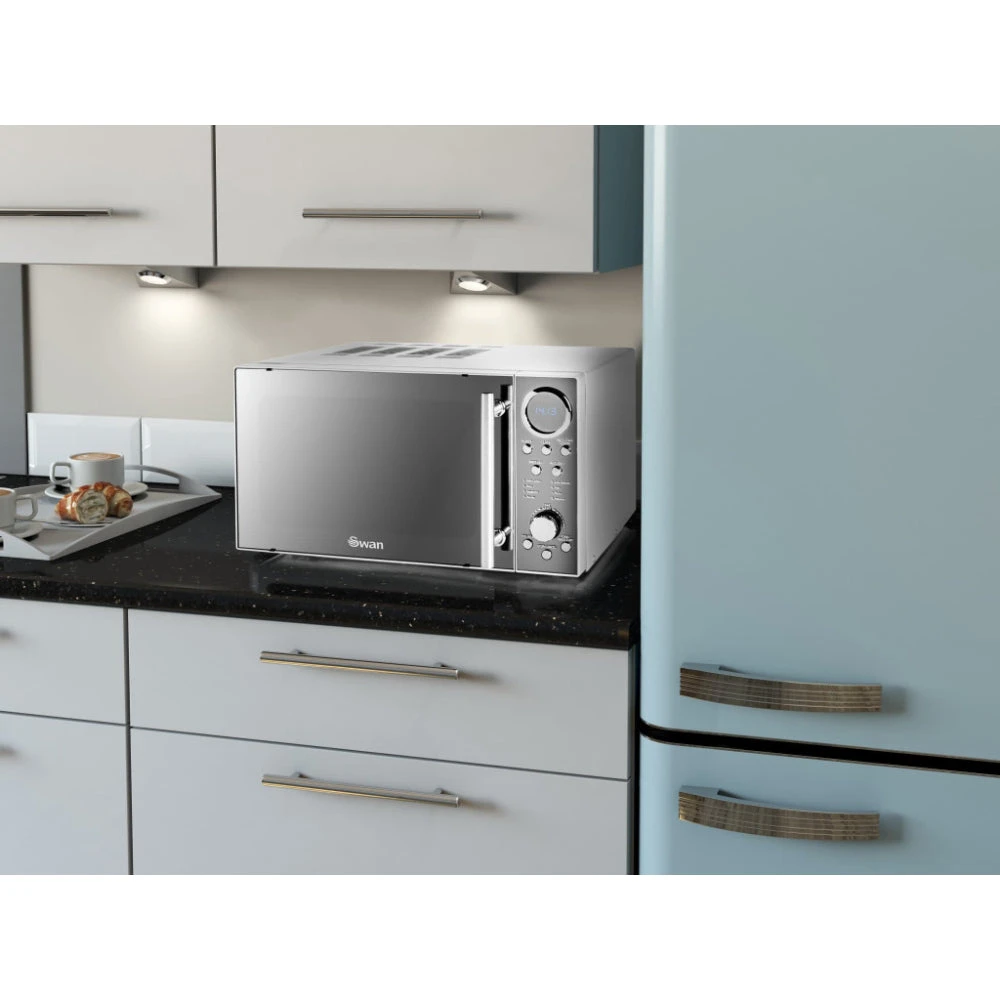 Want style and functionality in one, sleek , time-saving package? That’ll be the Swan 800W Digital Microwave. Featuring a large 20 litre capacity and tempered glass turntable, this fantastic microwave oven has what it takes to efficiently handle all manner of dishes.10 easy to use programmes and a digital timer takes the rigmarole out of reheating, defrosting and cooking. A cooking end signal alerts you when your meal is ready and 5 power levels mean that every cooking eventuality is catered for.