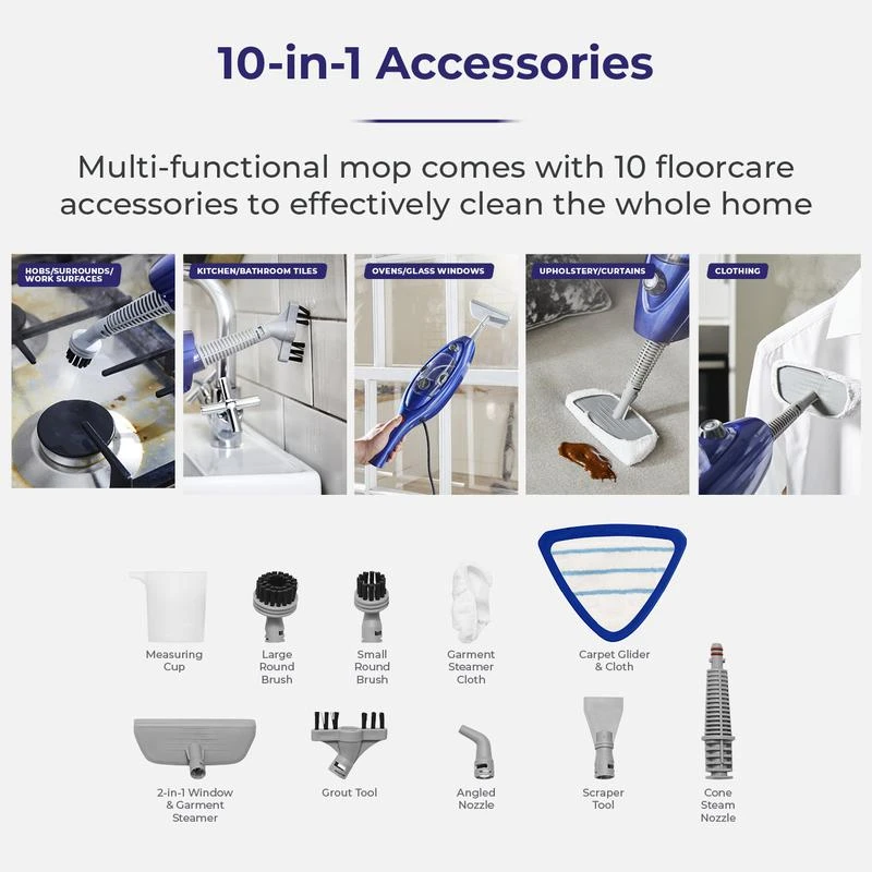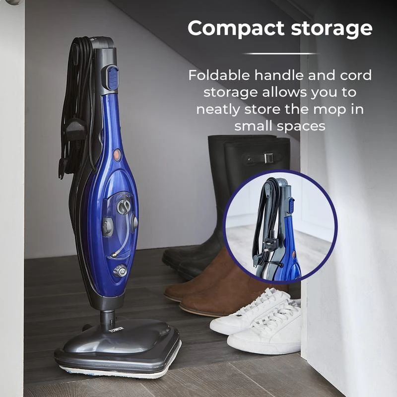 Tower’s multi-functional steam mop uses superior steam-powered performance to deep clean your carpets and leave hard floors with a polished look. Its lightweight design can be converted to a compact handheld steamer for a full cleanse around tight areas and restricted spaces in every room. The adjustable steam control is ready for use within 20 seconds, generating up to 20 minutes of continuous steam from a complete fill of the 250ml transparent water tank. The triangle-shaped mop head lets you steam clean every nook and cranny around your home, fitting in between room corners and close to skirting boards to keep every inch looking spotless. Equipped with 10 floorcare accessories, this steam mop provides a well-rounded tool for cleaning the whole house, including a microfibre cloth, a carpet glide, grout tool, small and large brush, garment steamer, scraper, garment steamer cloth, measuring cup, cone steam nozzle attachment, angled nozzle and an accessories adaptor.