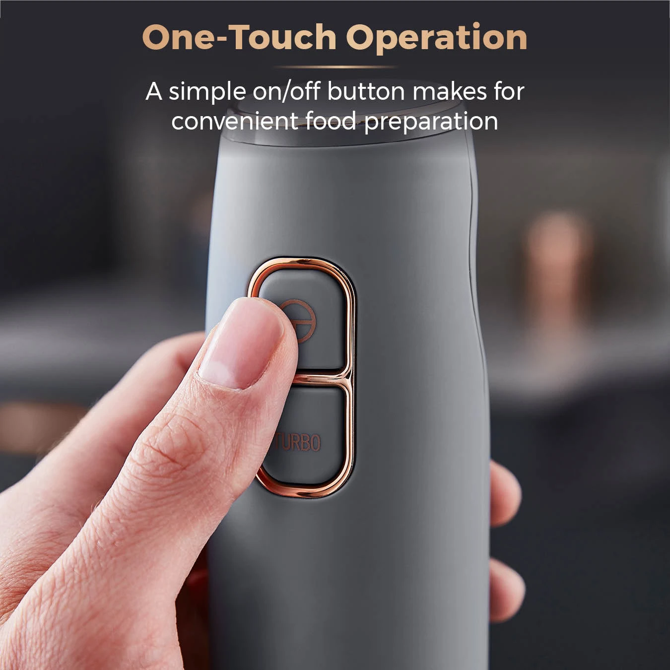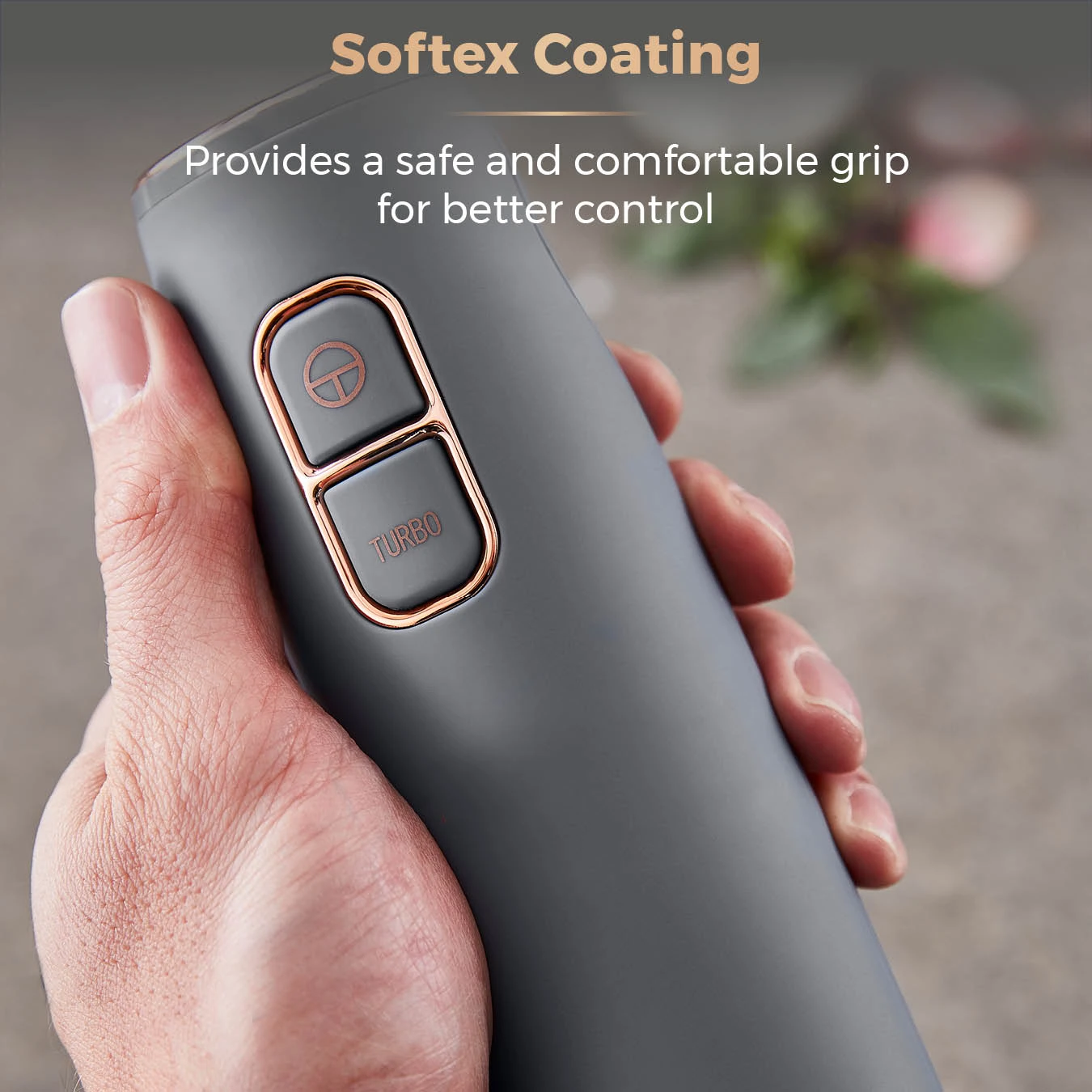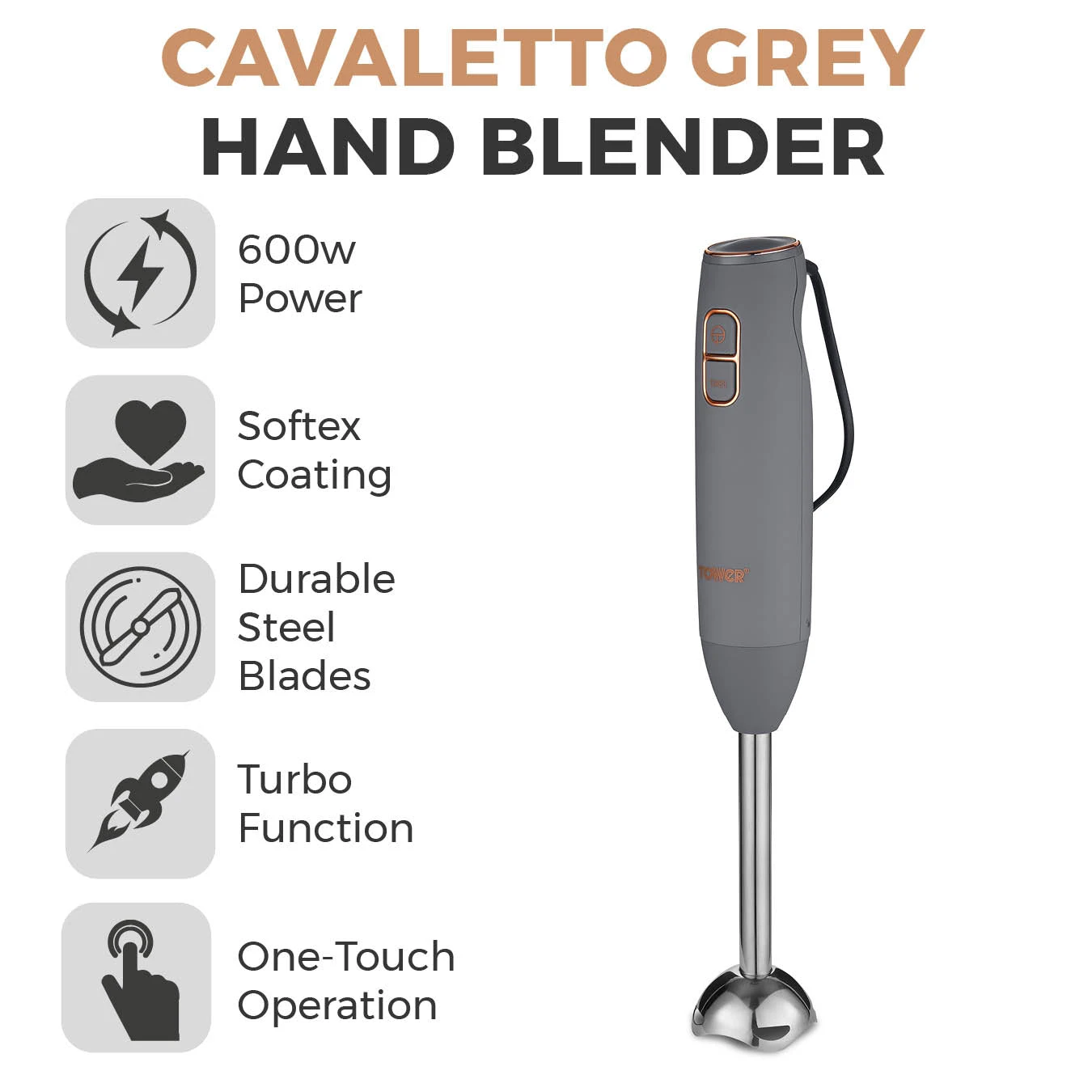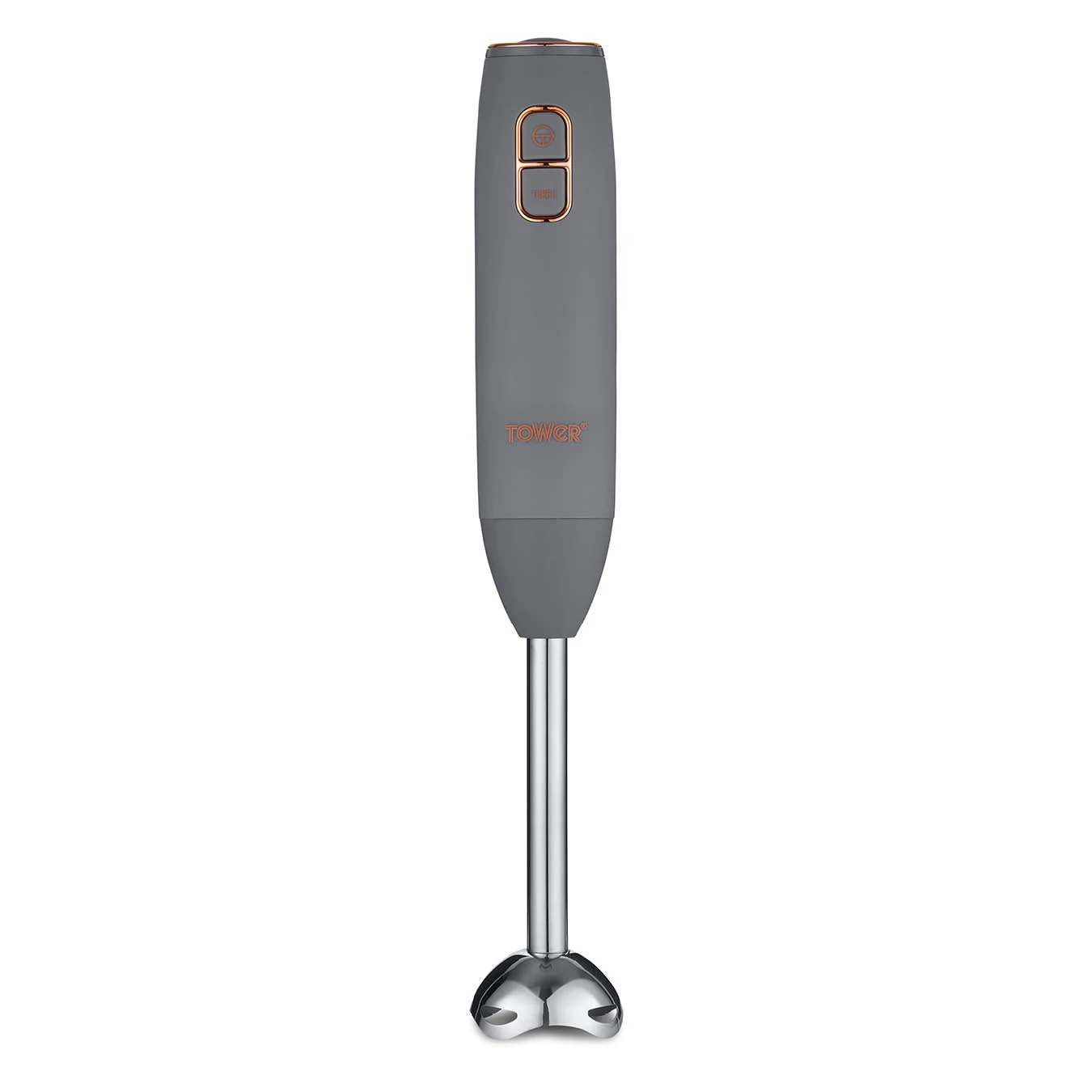 Perfect for a variety of food preparation needs, this Tower Cavaletto stick blender is a great addition to your kitchen collection. Featuring 600W of power, the blades blend through a range of ingredients, including fruit and vegetables, so you can make delicious healthy smoothies or soups. The ultra-long-lasting Durablade stainless steel blades are strong and robust, providing more efficient performance and durability. There are two different speed settings, which includes a turbo function, providing more control and efficient blending. This hand chopper features an ergonomic design with rose gold accents and a Softex coating that gives you added safety and support for comfortable performance. A one-touch button operation is easy to use, so you can quickly and efficiently prepare your food.
