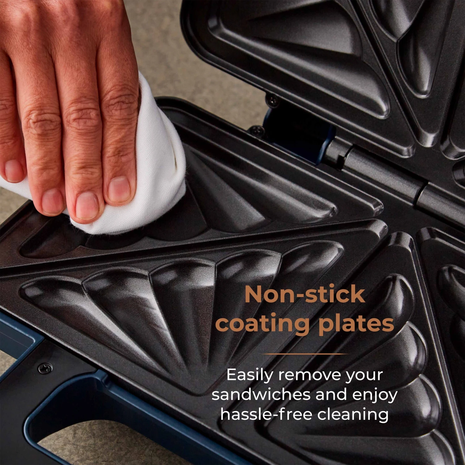 From ham and cheese to chocolate and strawberries, this sandwich maker is an absolute essential to your cooking needs. Tower has brilliantly designed it with deep fill ridge plates, giving you more room to pack in your favourite ingredients whilst the ridged edge seals them inside your sarnie. The non-stick coated plates help with removing the sandwich without leaving any residue behind and is simple to clean with a quick wipe. Furthermore, the non-stick coating promotes healthier eating options, requiring no oil or butter for flawless cooking every time. Power on and Ready-to-Go indicator lights means there is minimal guesswork as to when your sandwich is cooked whilst the automatic temperature controls allows evenly distributed heat for consistent cooking after each use. Its compact design in midnight blue with rose gold accents, can easily be tidied away to keep your countertops clear.
