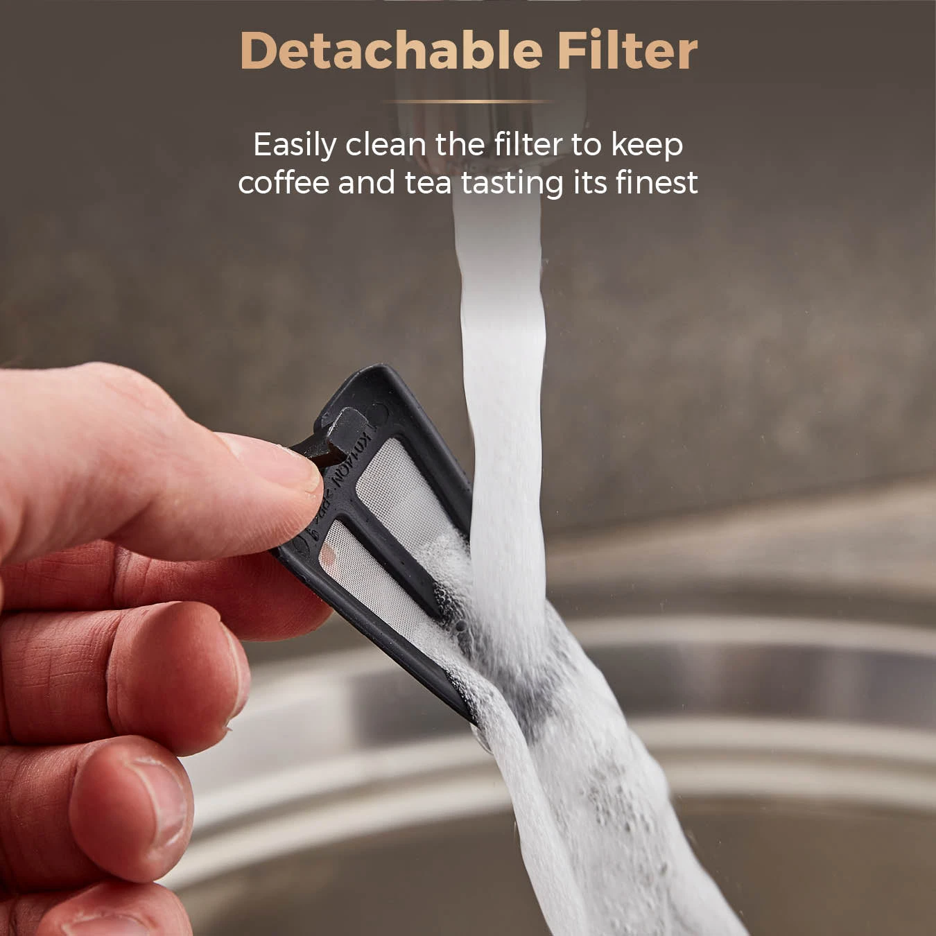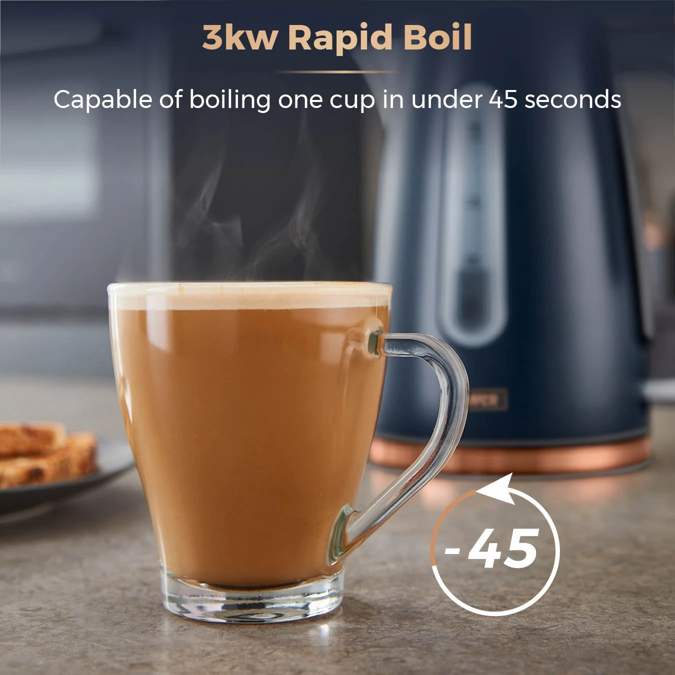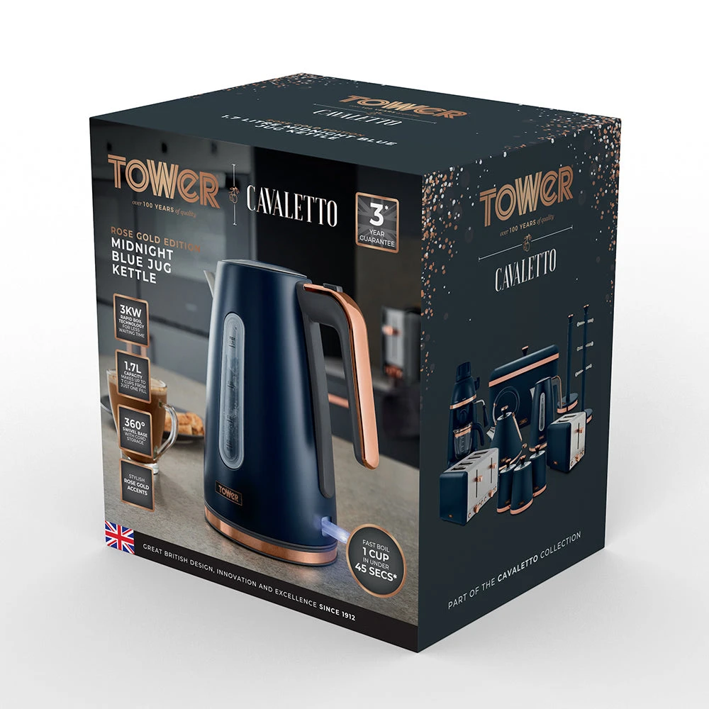 This Tower Cavaletto jug kettle features 3kW rapid boiling, so you can boil one cup in less than 45 seconds. The 1.7 litre capacity lets you make up to 7 cups at once on a single boil, making it perfect for playing host to family and friends. Signature rose gold accents complement the matte black finish, providing a subtle yet eye-catching addition to your modern kitchen decor. Includes a detachable limescale filter for easy cleaning and anti-slip feet for added stability on your kitchen worktop. Boil dry protection and auto shut-off functions offer peace of mind. Includes a 360 swivel base for left and right handed use and a large viewing window so you know when it’s time to refill.