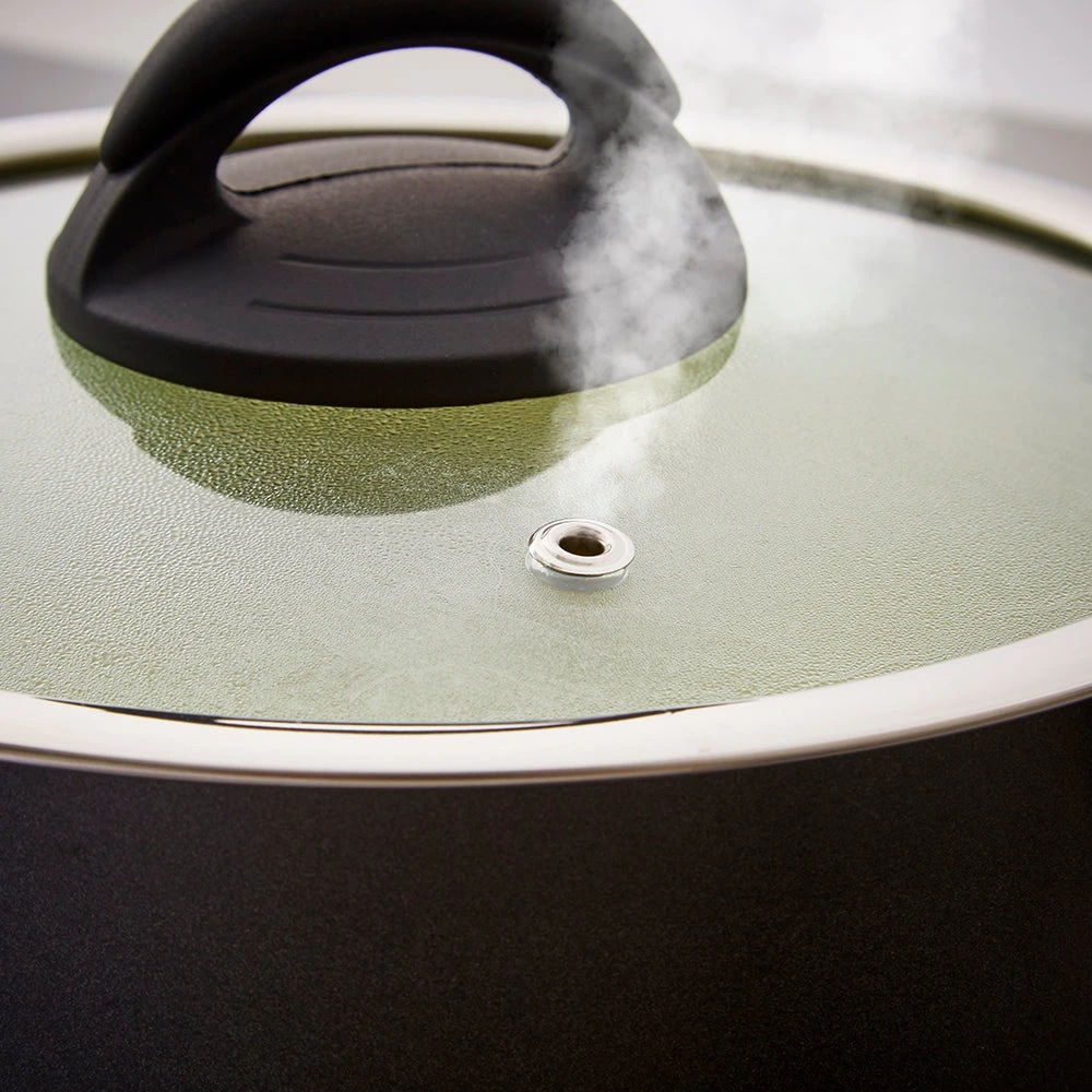 Tempered glass lid with steam release vent