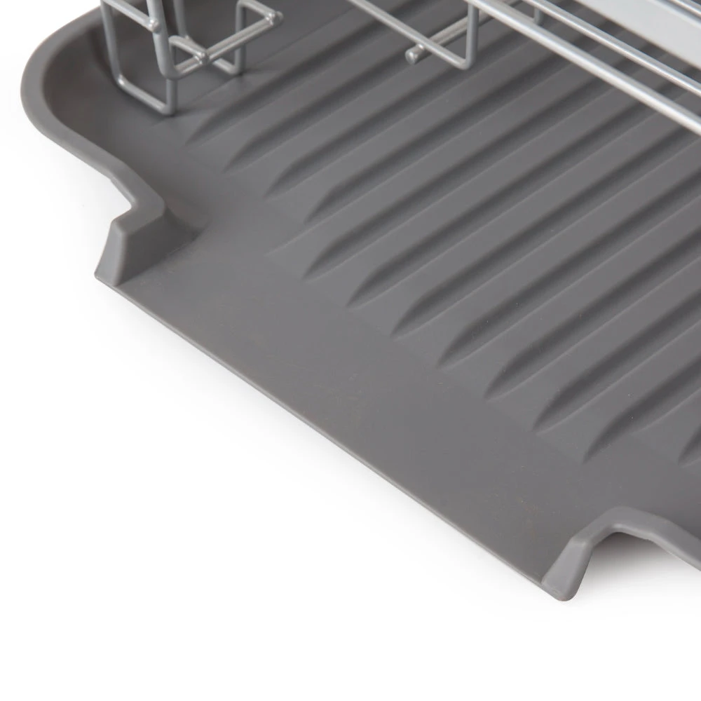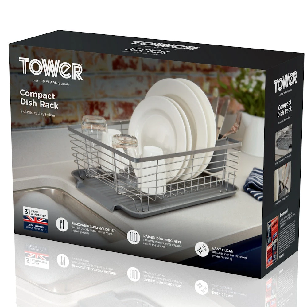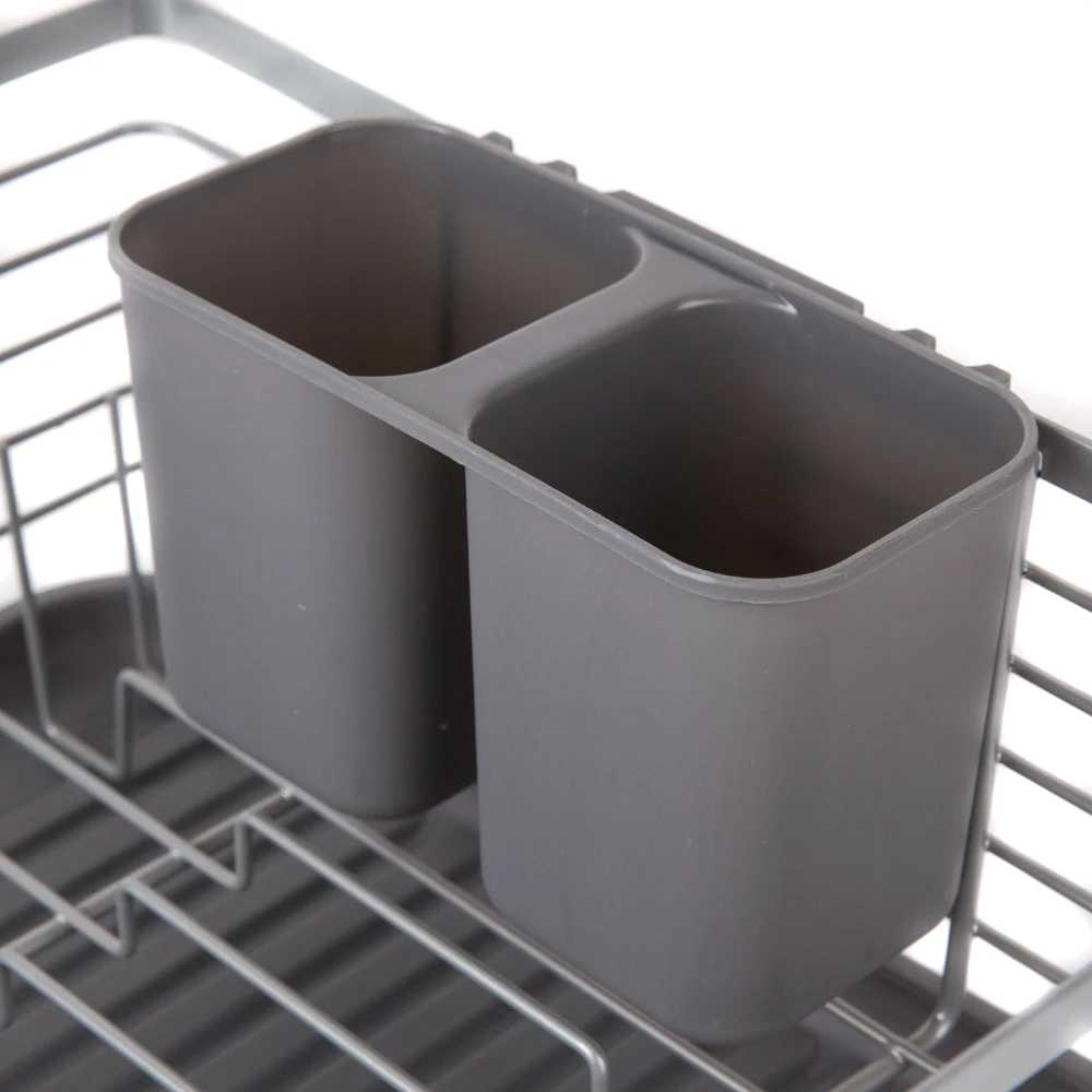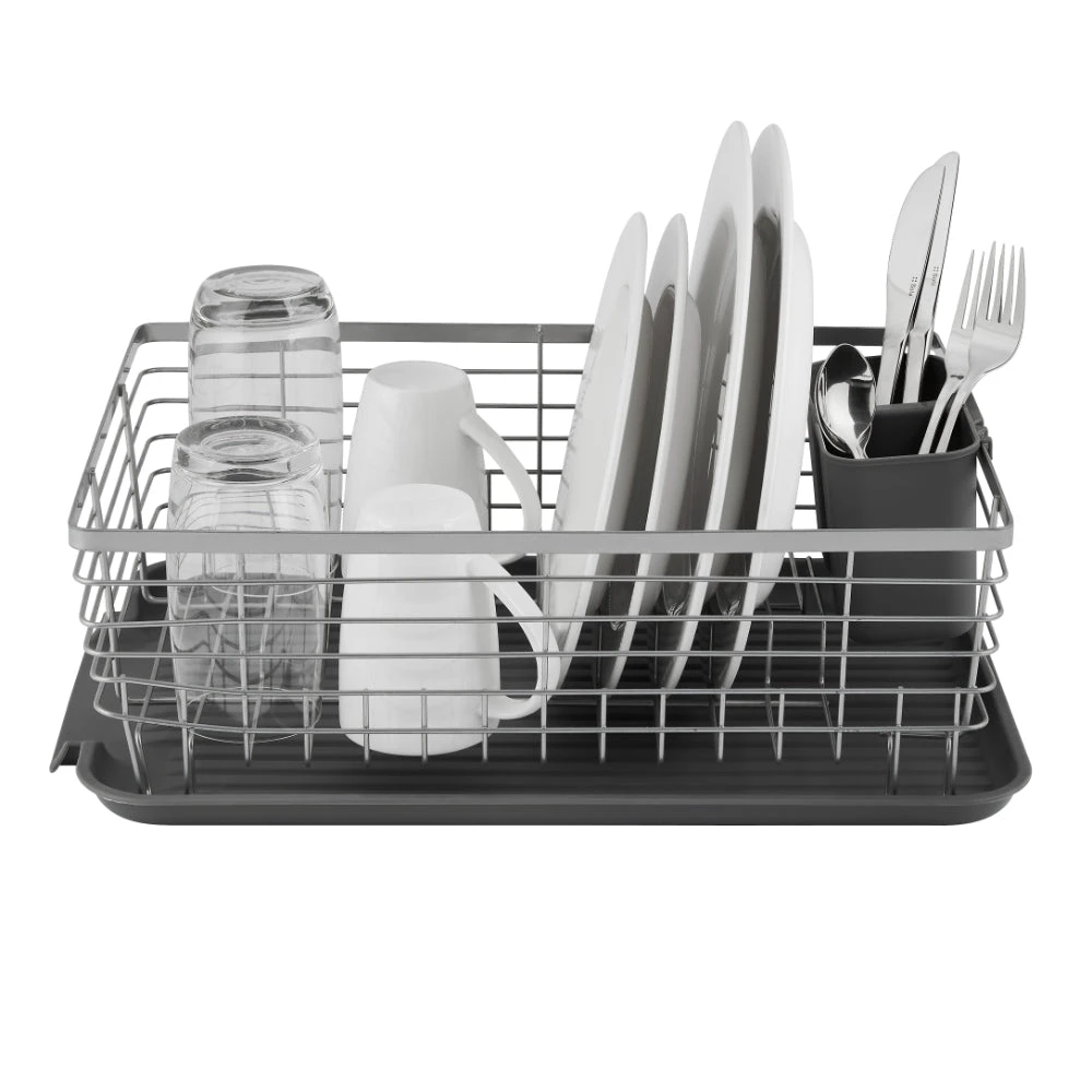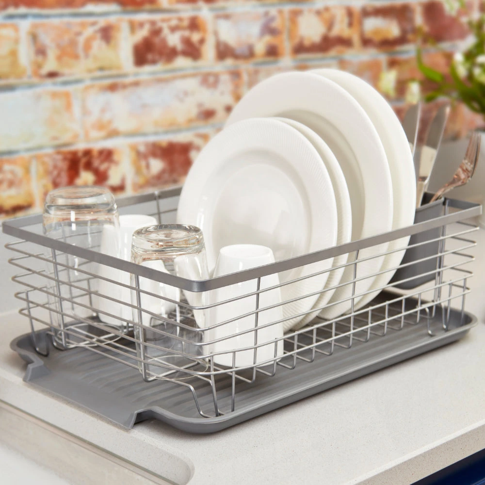 Make the most of your draining space by combining both quality and style with this compact dish rack. Formed from a durable stainless steel frame, this drainer features a sleek chrome cover coating to prevent against any cause of unwanted scratching and corrosion. Its compact design does not compromise on drying space, accommodating up to 9 plates at any one time, with a separate space for glasses and mugs to be drained. The draining tray’s raised ribs keep your items elevated during drying, so excess water can be drained away easily. Designed for ease of unloading your items as well as cleaning, both the draining tray and cutlery holder are fully detachable for the added benefit of a compact and tidy storage.