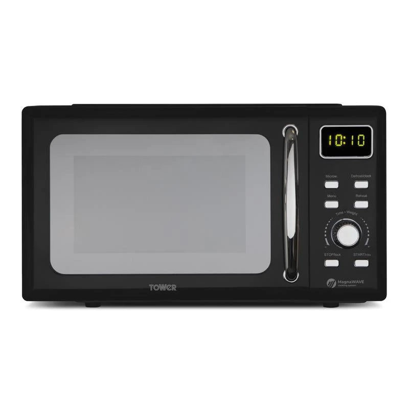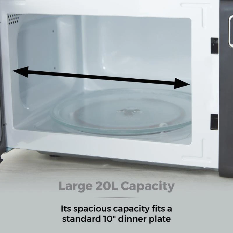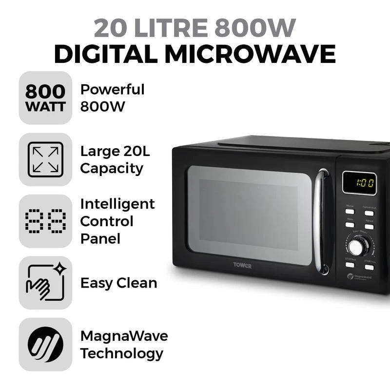 Powered by MagnaWave technology, concentrated waves circulate to ensure heat is distributed evenly for a well cooked meal – keeping intense flavours for amazing results. This microwave features a powerful 800W output for faster cooking with 5 adjustable heat settings. A huge inner 20L capacity easily fits a standard 10 dinner plate letting you cook for the whole family a 60-minute timer provides enough time to cook meals with precision. The defrost function cooks meals from frozen in minutes. 8 cooking pre-sets add variety to meal times with choices including potato, pasta, pizza, popcorn, vegetable, beverage, meat fish. The intelligent control panel features large buttons dial control to use the pre-sets, defrost settings manual selections, with a stay cool ergonomic handle for easy open closing. A high quality glass turntable ensures food is cooked thoroughly for delicious results, while a sleek mirror door looks great in modern kitchens the easy clean interior requires a simple wipe after use.