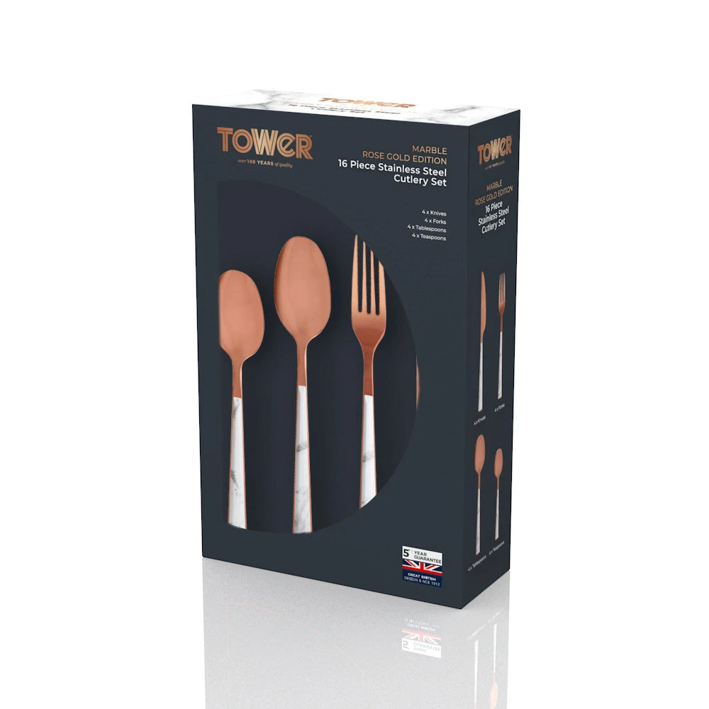 Bridge the gap between plateful to mouthful using quality cutlery from Tower. This 16 piece white marble and rose gold cutlery set is shaped using thick-cut stainless steel to provide robust use for every occasion, whether you’re enjoying family meals or sophisticated dinner parties. The tableware set consists of 4 knives, 4 forks, 4 tablespoons and 4 teaspoons, each individually coated in a rich rose gold plating and finished with white marble-patterned handles to give your dining table a distinctive look. Hand-wash is recommended to maintain the elegant finish.
