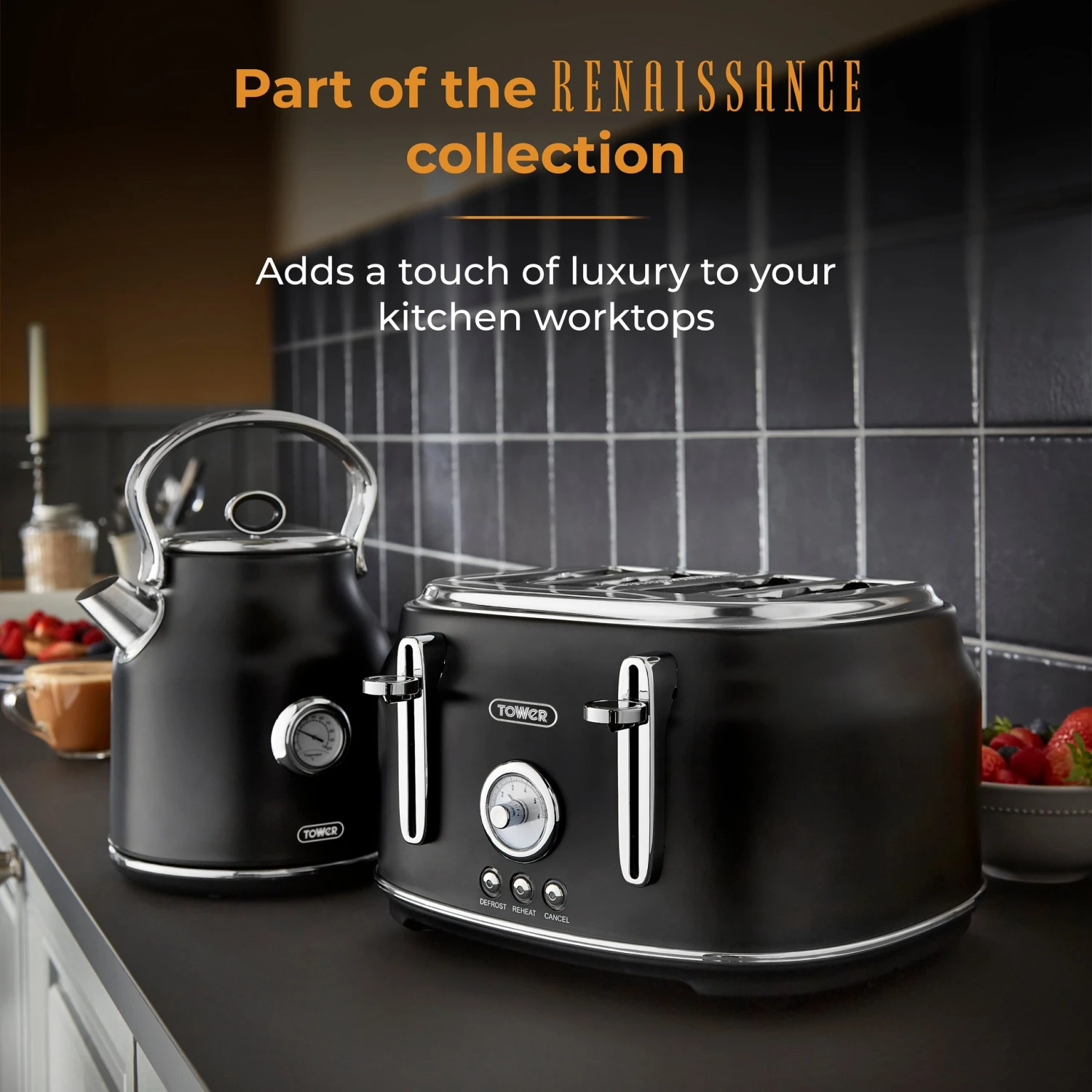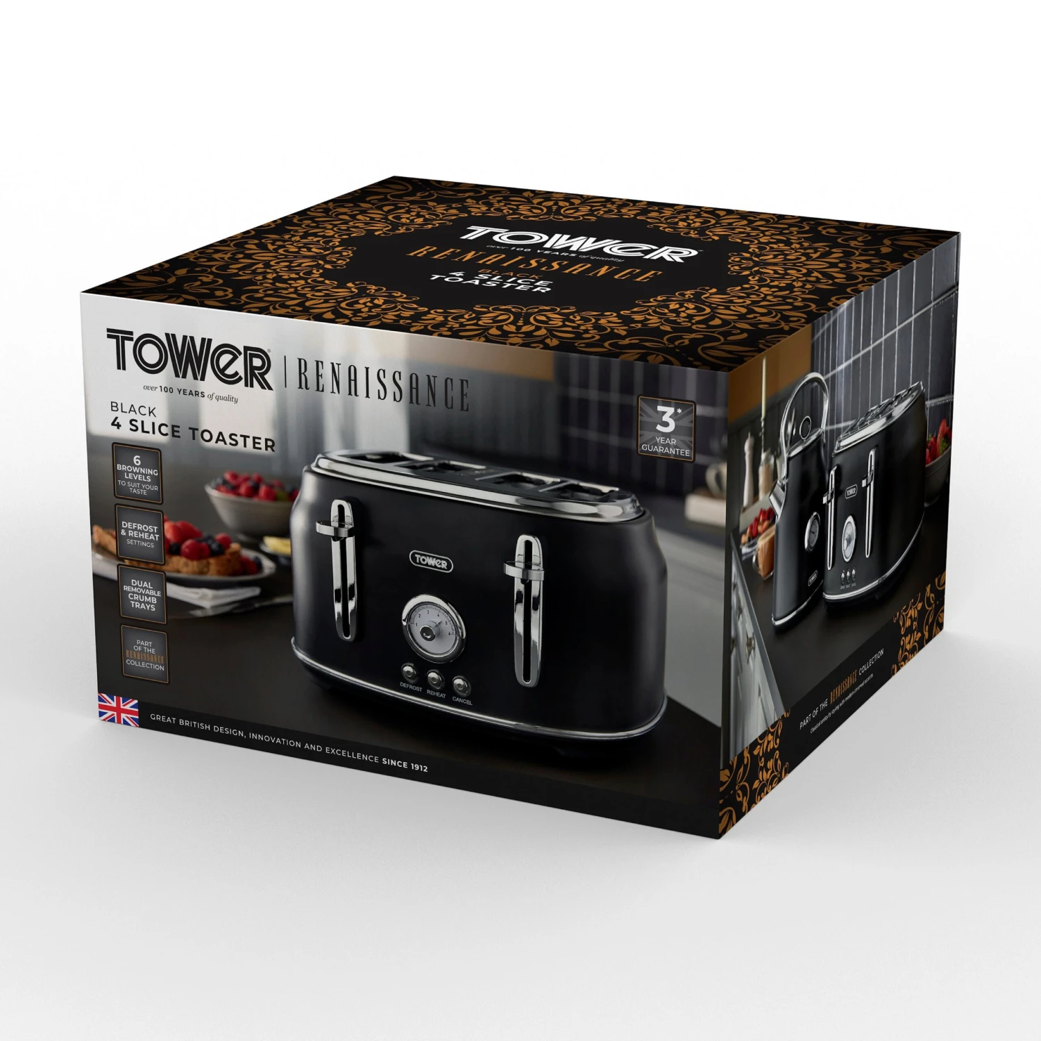 Enjoy toast to your taste every breakfast time with the Tower Renaissance 4 Slice Black Toaster. With its durable body and removable crumb trays, this is the ideal long-lasting kitchen essential that perfectly toasts bread, crumpets and bagels. Simply remove the trays and empty the contents straight into the bin to keep your kitchen tidy. Toast to your taste with the 7 browning levels that can be easily adjusted, alongside the defrost, heat and cancel functions to give you total control over your toasting needs. The stylish design of this toaster will make a statement on your kitchen countertop, adding a touch of elegance to your electrical appliances and fits perfectly with the Tower Renaissance Black Kettle.