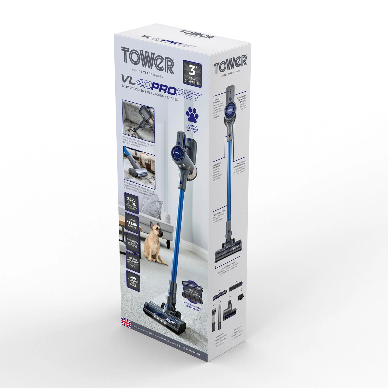 Effortlessly achieve a more efficient and deeper clean around the home with the VL40 Pro Pet 3-in-1 Vacuum Cleaner. Its powerful built-in rechargeable battery delivers 35 minutes of continuous run time from a single 4 hour charge for hassle-free cleaning. Use as a cordless vacuum for carpets and hard floors, a detachable handheld for cars, stairs and upholstery or extend the pole for higher hard-to-reach areas like ceilings and curtains. The cyclonic suction provides consistent airflow, effortlessly sucking up and breaking down dirt from all floor types for a thorough clean. Its ultra-efficient motorised floor head agitates dust and dirt leaving carpets and hard floors clean and fresh. The turbo pet and upholstery brush head effortlessly picks up deeply embedded pet hair so you get a more efficient and deeper clean around the home. It transforms into a handheld vacuum that is perfect for staircases, cars, upholstery and pet hair.