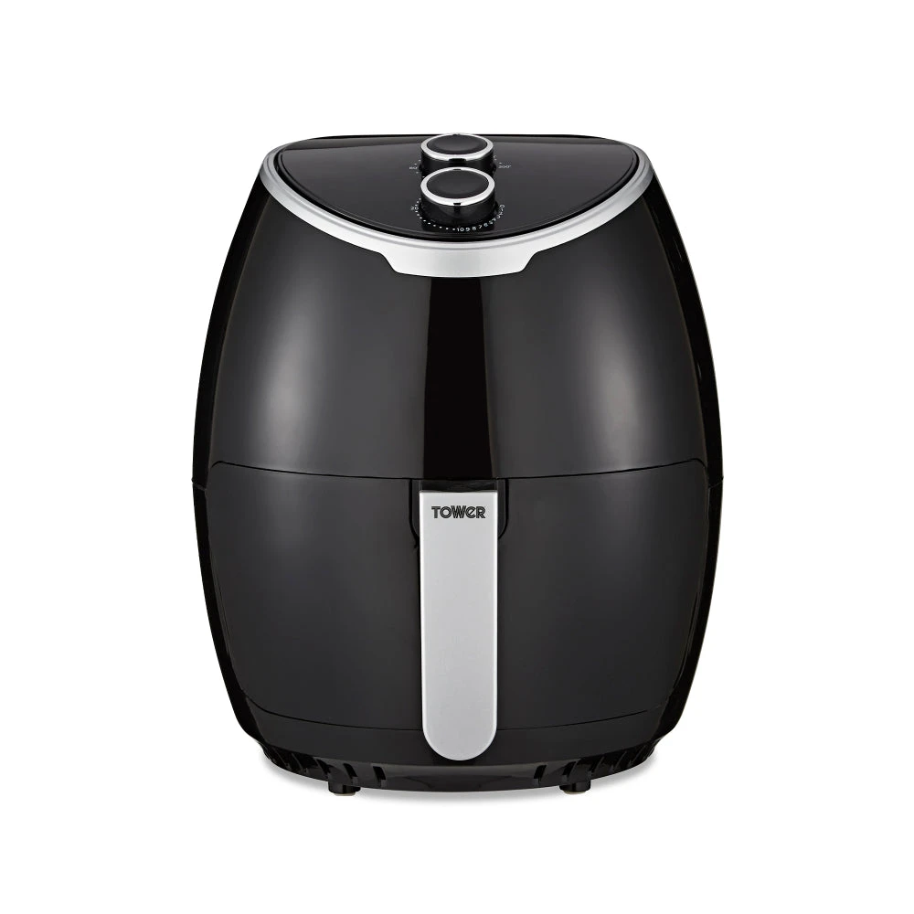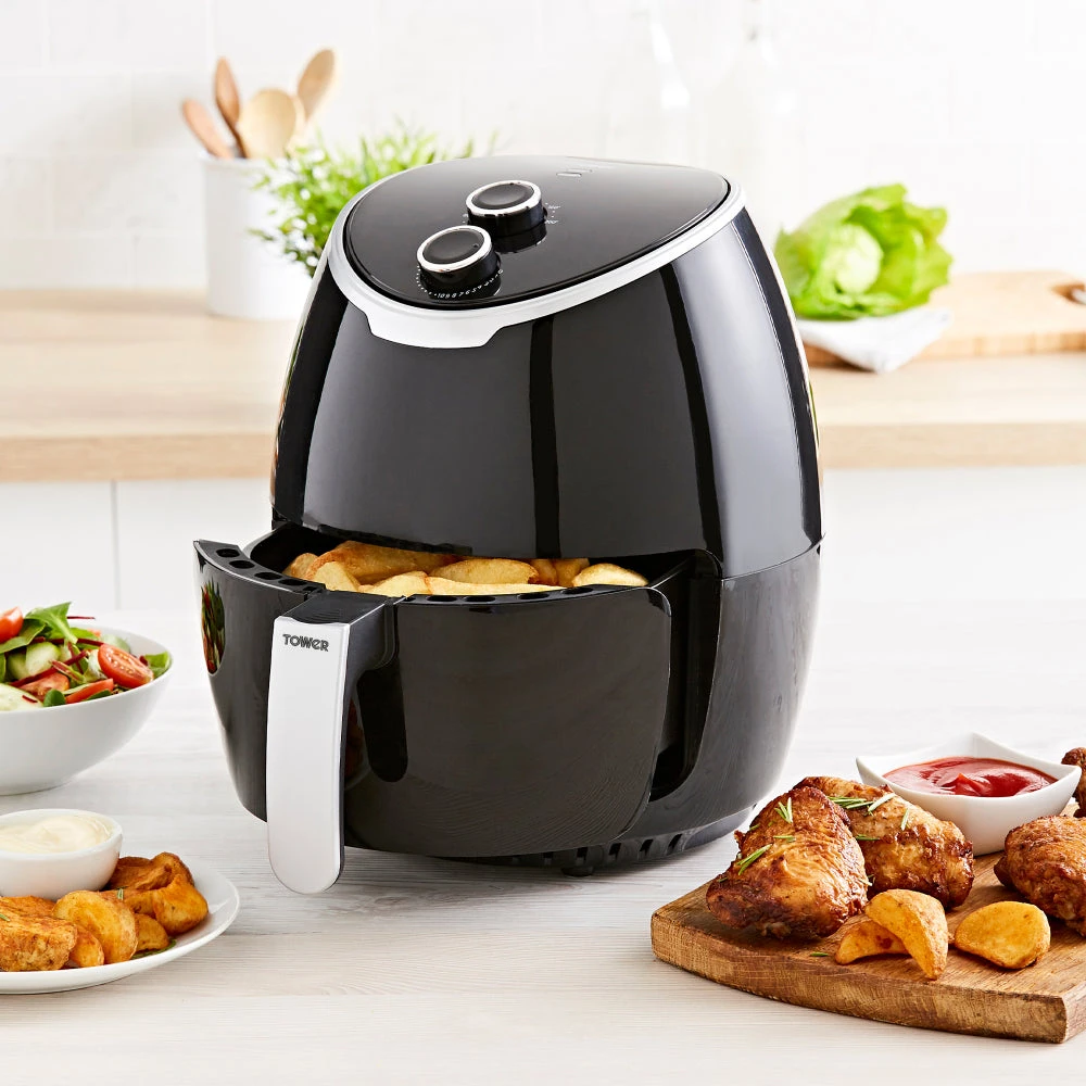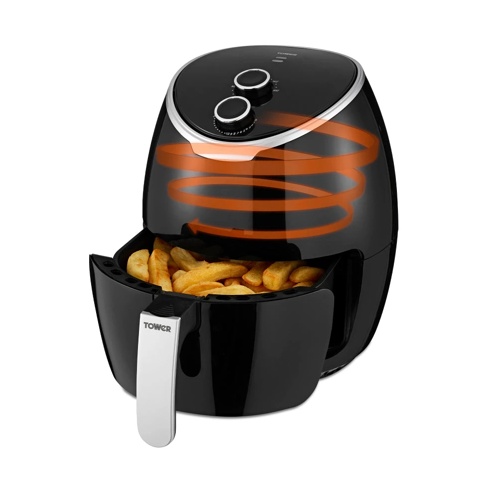 This large 4 litre black Tower air fryer is the perfect kitchen companion for those looking for a fast and convenient alternative to conventional family cooking. Featuring vortx technology, all you need is a minimal amount of oil, and then the hot air rapidly circulates evenly around the air fryer, ensuring your ingredients are cooked thoroughly with a nice crispy texture, all while having 99% less fat for more healthier cooking. Multi-functional in its design, this health fryer lets you fry, grill, bake and roast, so you can make a wide range of dishes, such as chicken, vegetables, pizza, chips and even cake, which is perfect for a lover of food. A 30-minute timer lets you quickly schedule the cooking cycle of your air fryer oven, so your food is ready for you in no time. Featuring manual controls, the two dials let you easily adjust the timer and temperature between 80 and 200C. The basket can be removed, making it easier to wash up the excess mess, leaving you more time to relax in the evening.